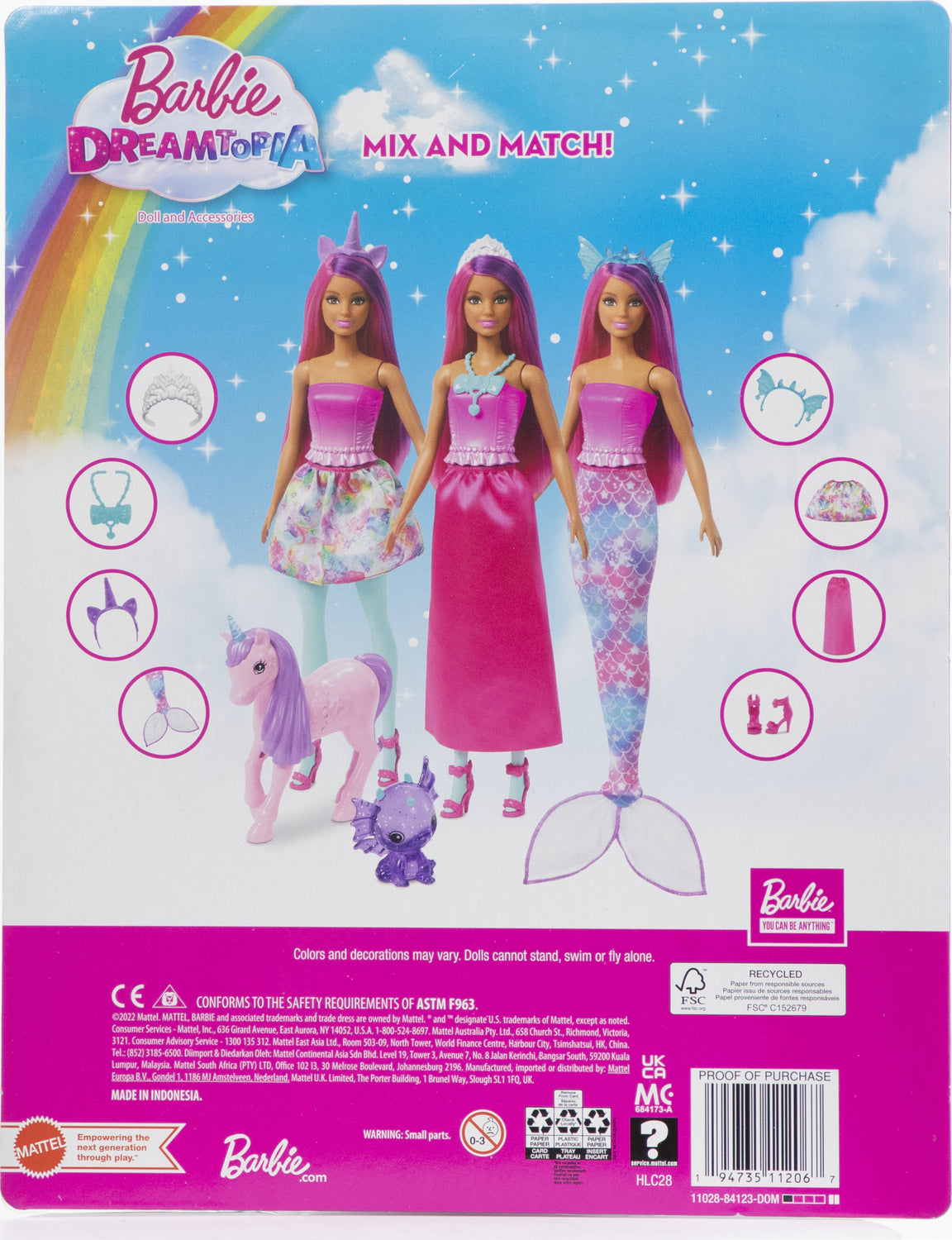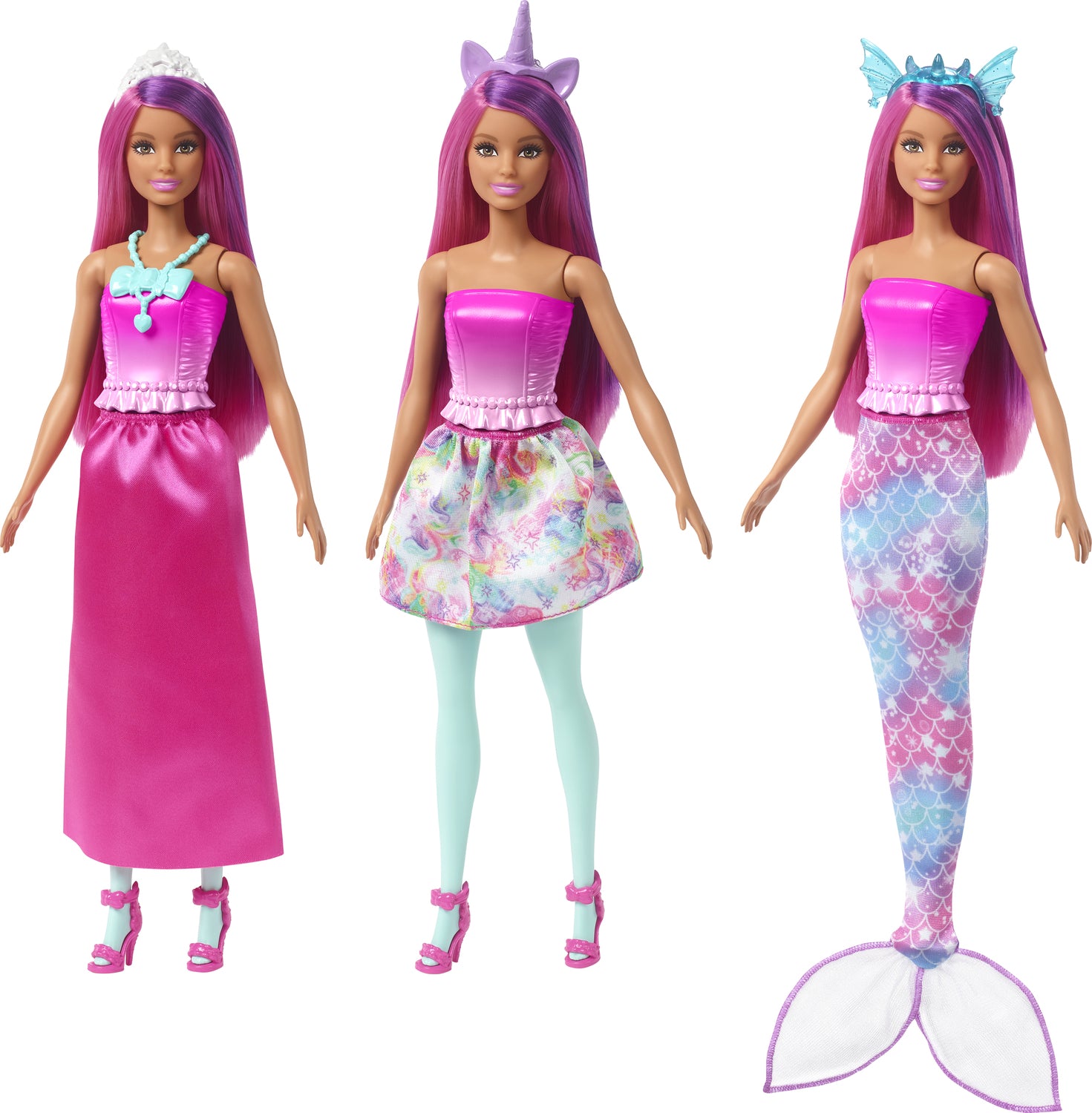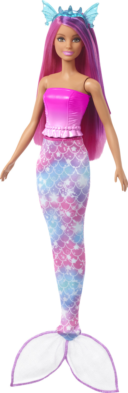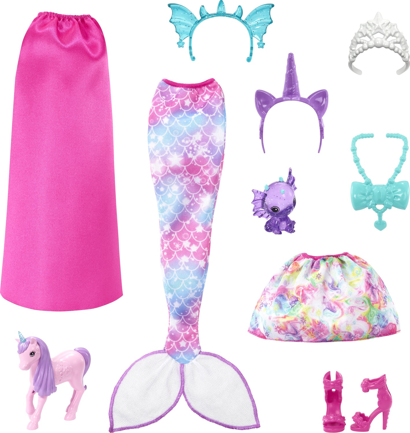 This dress-up Barbie® doll offers transformational play from land to sea to air! She comes with multiple fashions and accessories, including a mermaid tail, two skirts, themed headbands and a necklace. The colorful Barbie® fantasy set also includes a baby dragon and unicorn for even more storytelling fun. Doll cannot stand alone. Colors and decorations may vary.