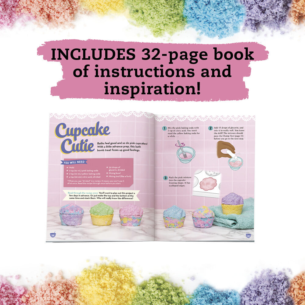 Fizzy fun with a bakery twist! Craft up to 12 bath bombs that fizz in the tub, with all the supplies you need. Simply mix the pre-colored baking soda, citric acid, and glycerin, and mold them into one of 6 shapes. Adorable pastel projects include a donut, macaron, cupcake, waffle, and a milkshake in a tiny, to-go cup. Package your favorite bath bombs in an easy-to-fold gift box to create the perfect presentation.