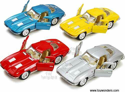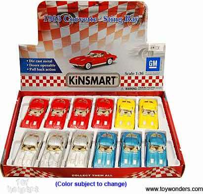5358D Kinsmart - 1963 Chevy Corvette Stingray Hardtop. 1:36 scale diecast collectible model car. This Chevrolet Corvette Sting Ray is a 5"L x 2"W x 1.5"H diecast metal car with pullback action and openable doors. This Chevy Corvette is manufactured by Kinsmart. GM is a trademark of the General Motors Corporation.