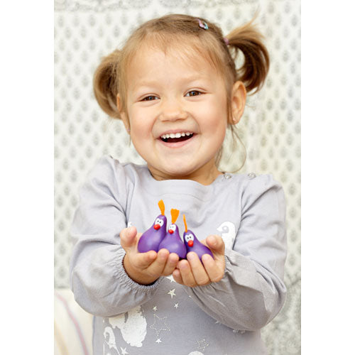 Down on the farm, the chickens are as happy as can be on their perch. But when one moves, everything starts to wobble! Get the chickens, wagon wheels and hay bales off the rocking perch without making it topple. The pieces in this counting game have different weights and point values. The player with the highest score wins the game. A game of balance, counting and laughs where the roost goes Chickyboom! This all wooden balancing game is sustainably made.