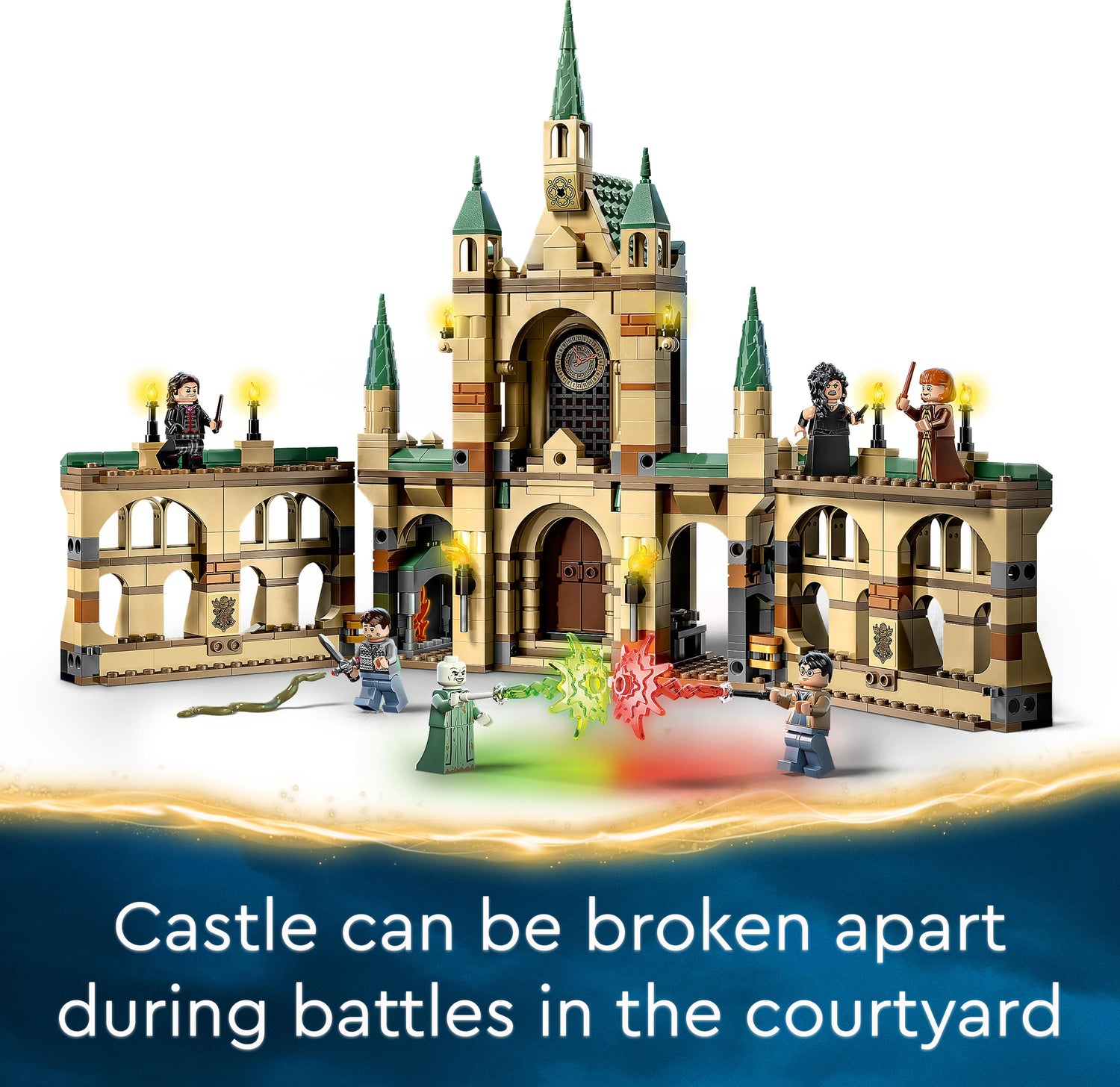 - The buildable Harry Potter toy features a detailed LEGO brick-built section of Hogwarts Castle that can be broken apart during epic battles
