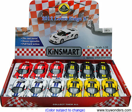 5361DF Kinsmart - 2012 Lotus Exige S Hardtop #3. 1:32 scale diecast collectible model car. This Lotus Exige S is a 5"L x 2.25"W x 1.25"H diecast metal car with pull back action and openable doors. This Lotus Exige S is manufactured by Kinsmart.