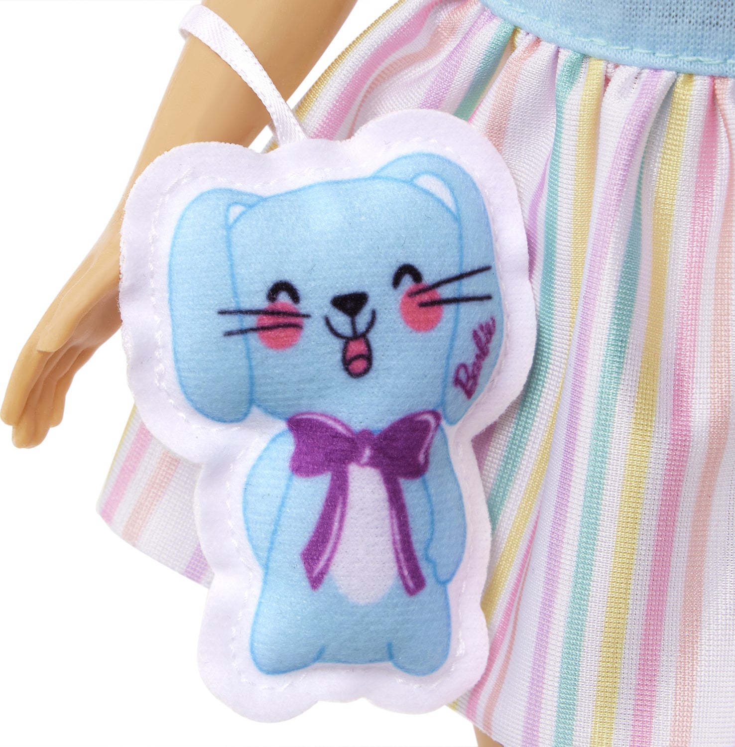- She comes with a printed plush bunny to go on adventures with and inspire nurturing. It even has a wristlet that loops around the doll’s hands so she can carry her soft and squishy animal friend!