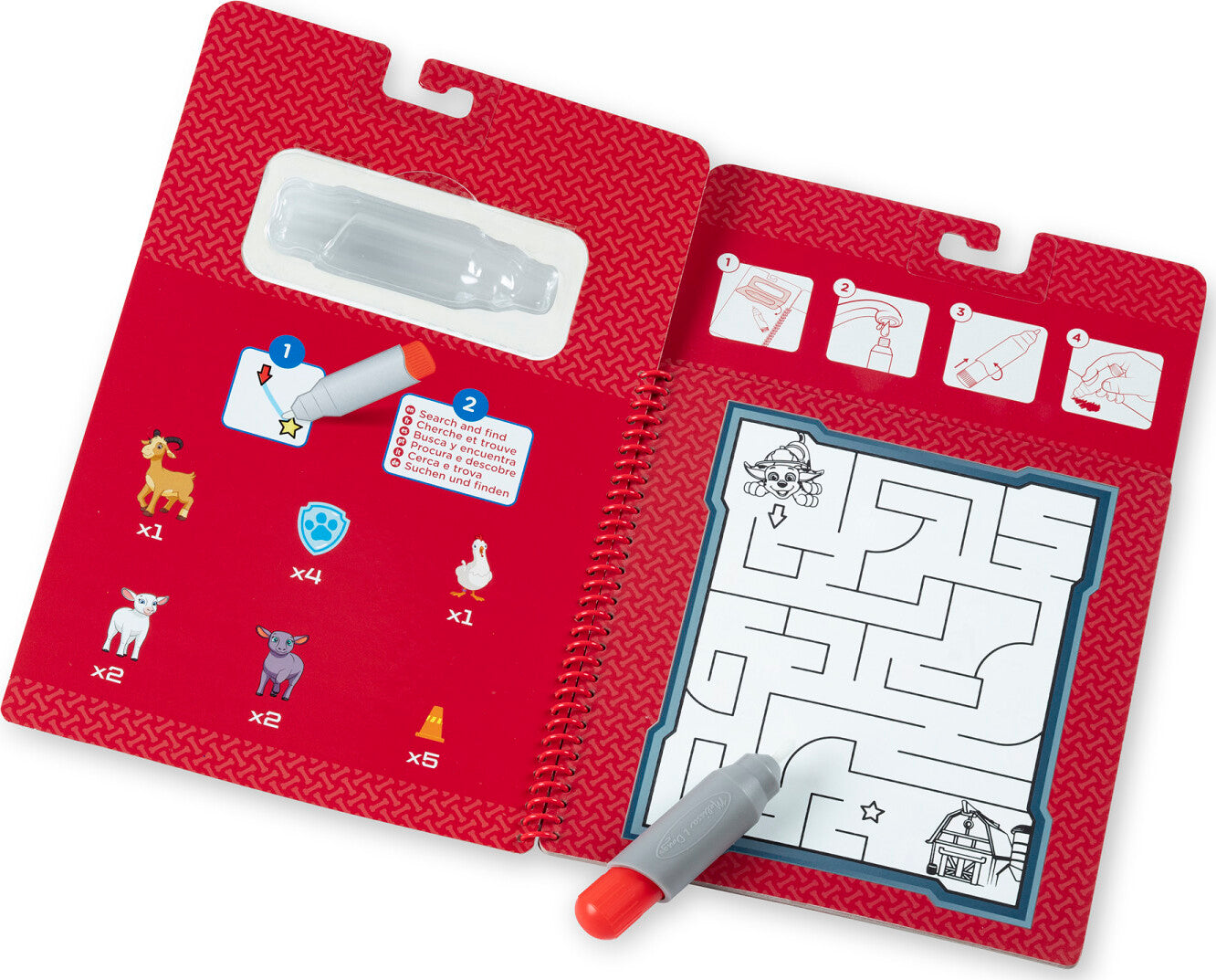 4 PAW Patrol-themed boards featuring the pup Marshall, and refillable water pen. Reusable pages are white when dry, reveal colors when wet; search and find activities on every page. Chunky-size water pen is easy to fill, easy to hold. Compact, spiral-bound format - great for travel.