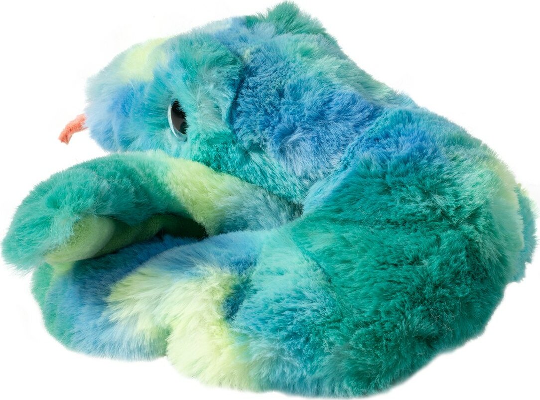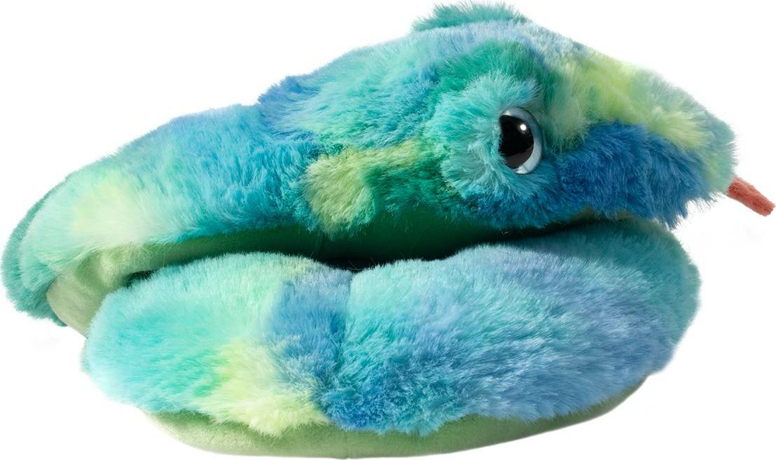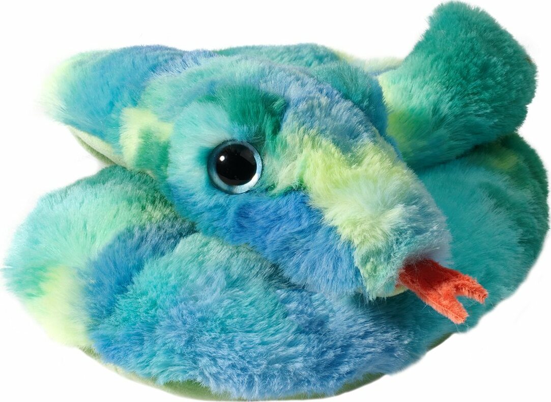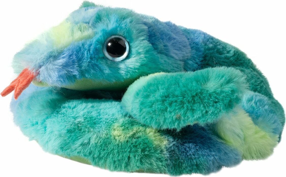 Curled up into a tight ball, Pretzel the Snake stuffed animal hides out amidst the jungle leaves. Pretzel is just a little Snake and gets nervous easily when there are bigger animals out and about so, more often than not, you can find him tucked away in a safe nook His multicolored design features a blend of blues, greens, and yellows that provides perfect camouflage.