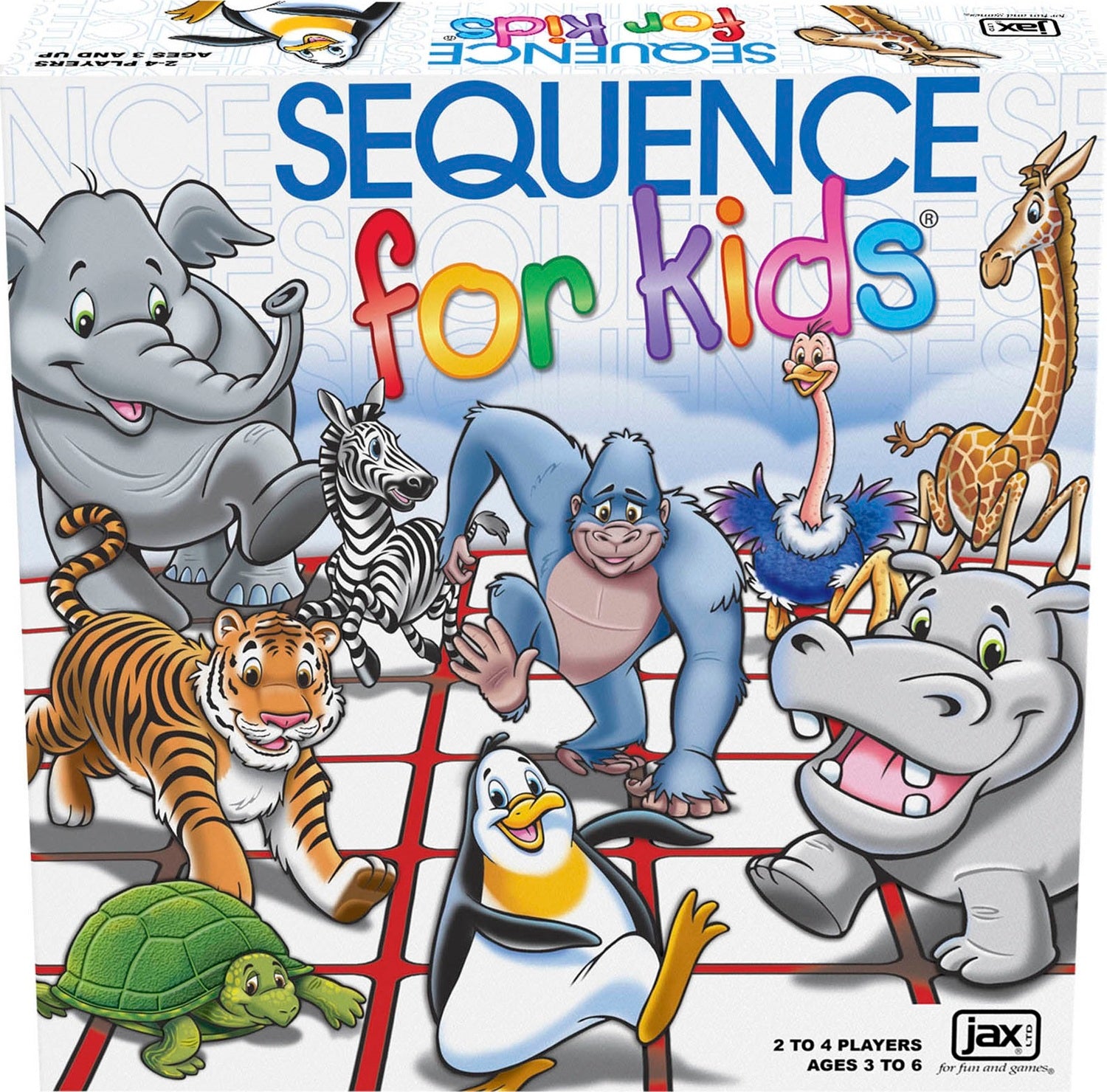It's the classic game of SEQUENCE made just for kids! Play an animal card from your hand, and place your chip on the corresponding animal on the board. Wild cards add excitement to the game - use a unicorn card to place your chip anywhere, or use a dragon card to remove an opponent's chip. The first player with four chips in a row wins! This exciting strategy game helps develop logical thinking skills. Reading is not required to play. Targets kids ages 3-6 and is for 2-4 players.