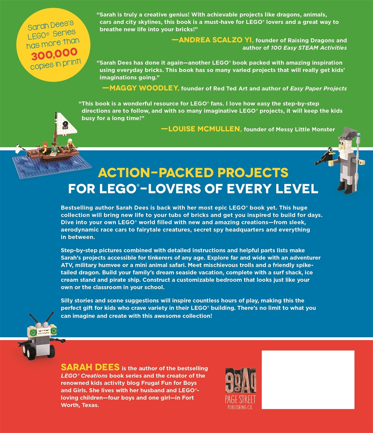 Step-by-step pictures combined with detailed instructions and helpful parts lists make Sarah’s projects accessible for tinkerers of any age. Explore far and wide with an adventurer ATV, military humvee or a mini animal safari. Meet mischievous trolls and a friendly spiketailed dragon. Build your family’s dream seaside vacation, complete with a surf shack, ice cream stand and pirate ship. Construct a customizable bedroom that looks just like your own or the classroom in your school.