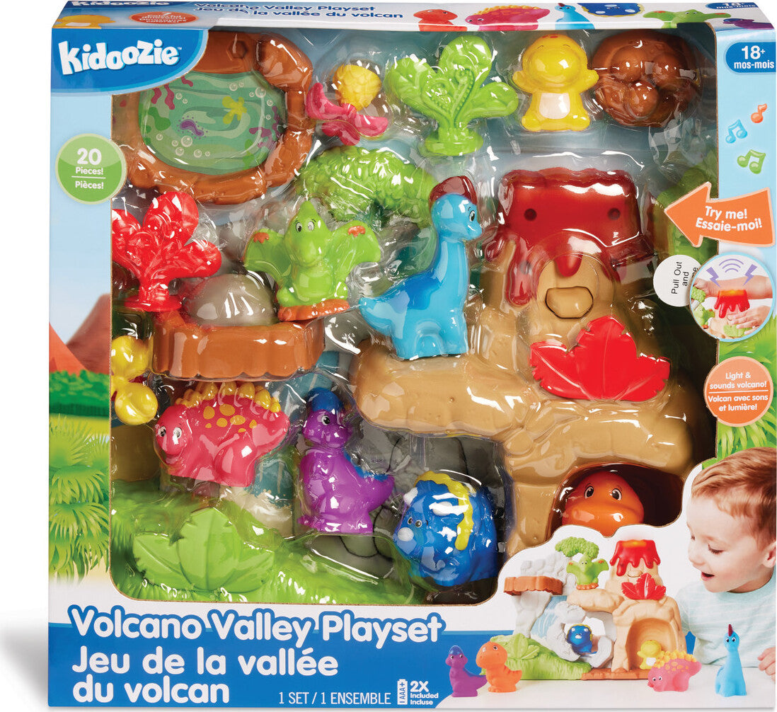 Watch and listen to the volcano erupt as the dinosaurs roam around. 20 piece set including 7 dinosaurs, 2 boulders, 4 plants, dino mountain and much more. Features include break-through rocks, a boulder drop and a dino slide. Requires 2 "AAA" batteries (included).