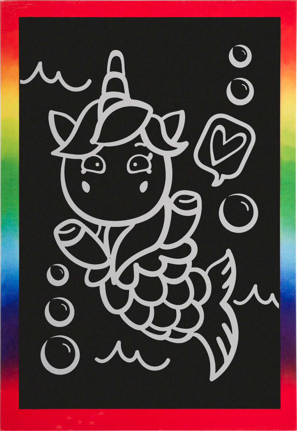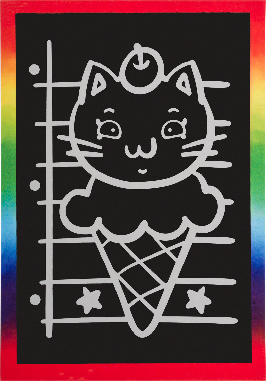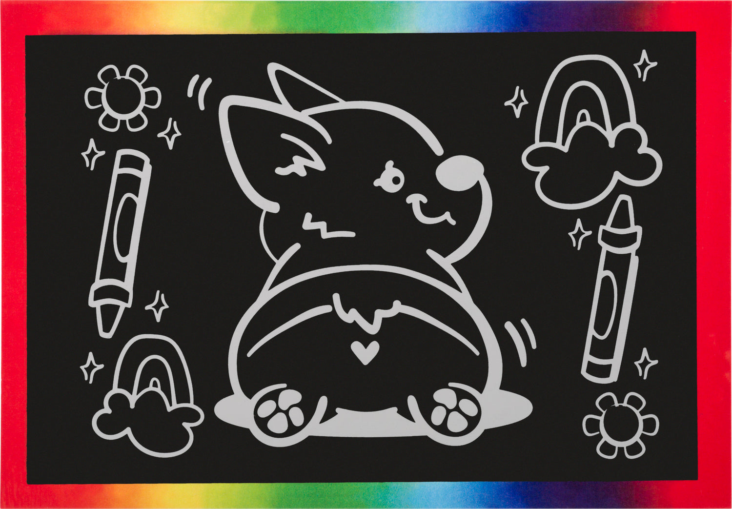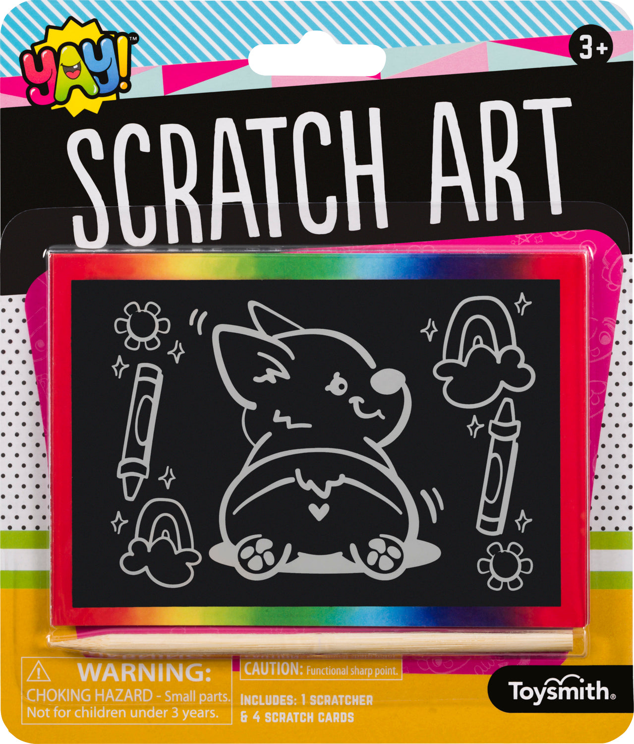 Each YAY!™ Scratch Art kit includes 4 rectangular scratch cards with rainbow frames and outlined images, and 1 wooden scratcher tool. Image styles vary but may include animals and flowers. Scratch way at the gray areas to reveal shades of red, orange, yellow, green, blue, and purple. A colorful and peggable blister package contains all 5 items.